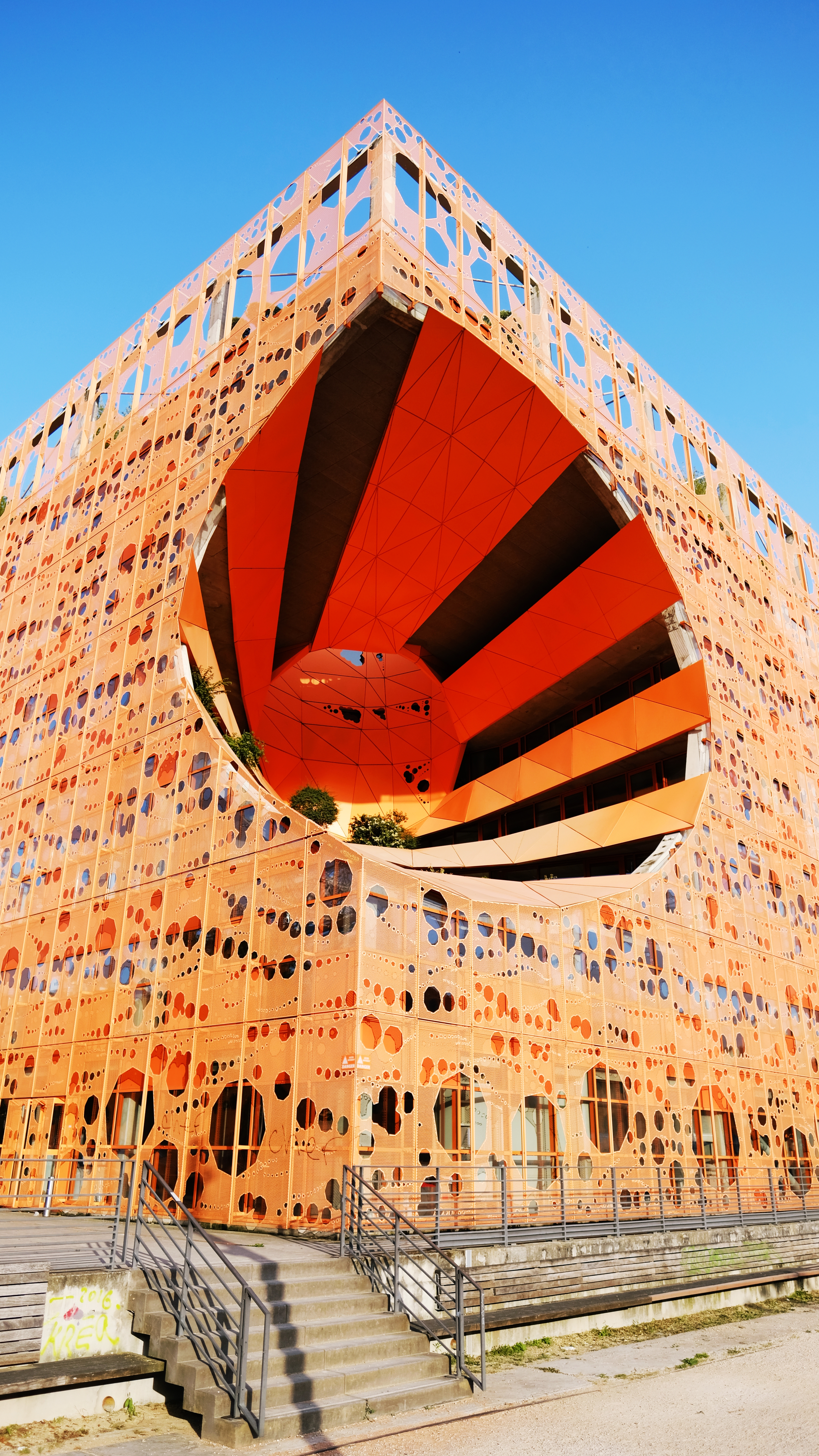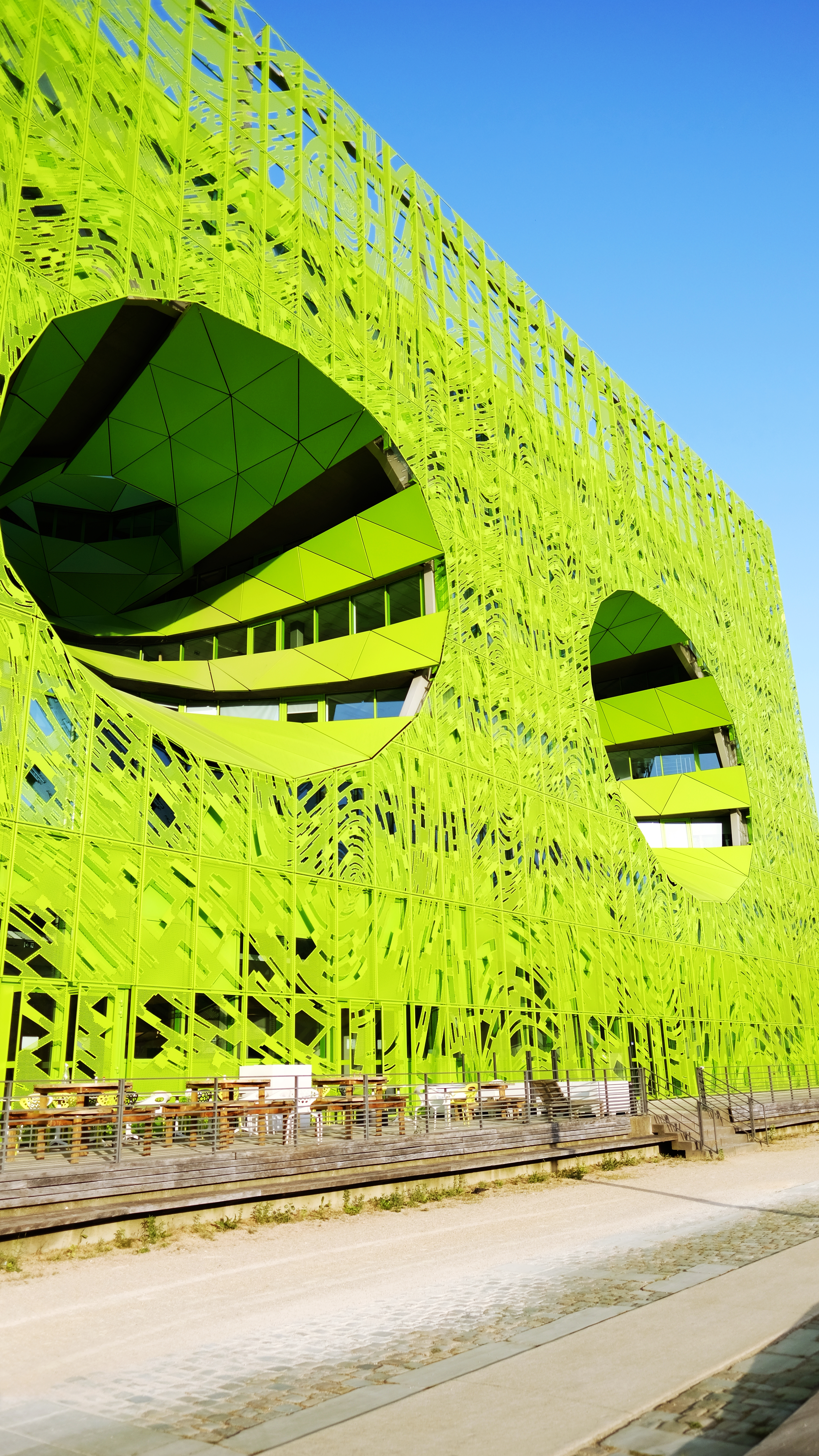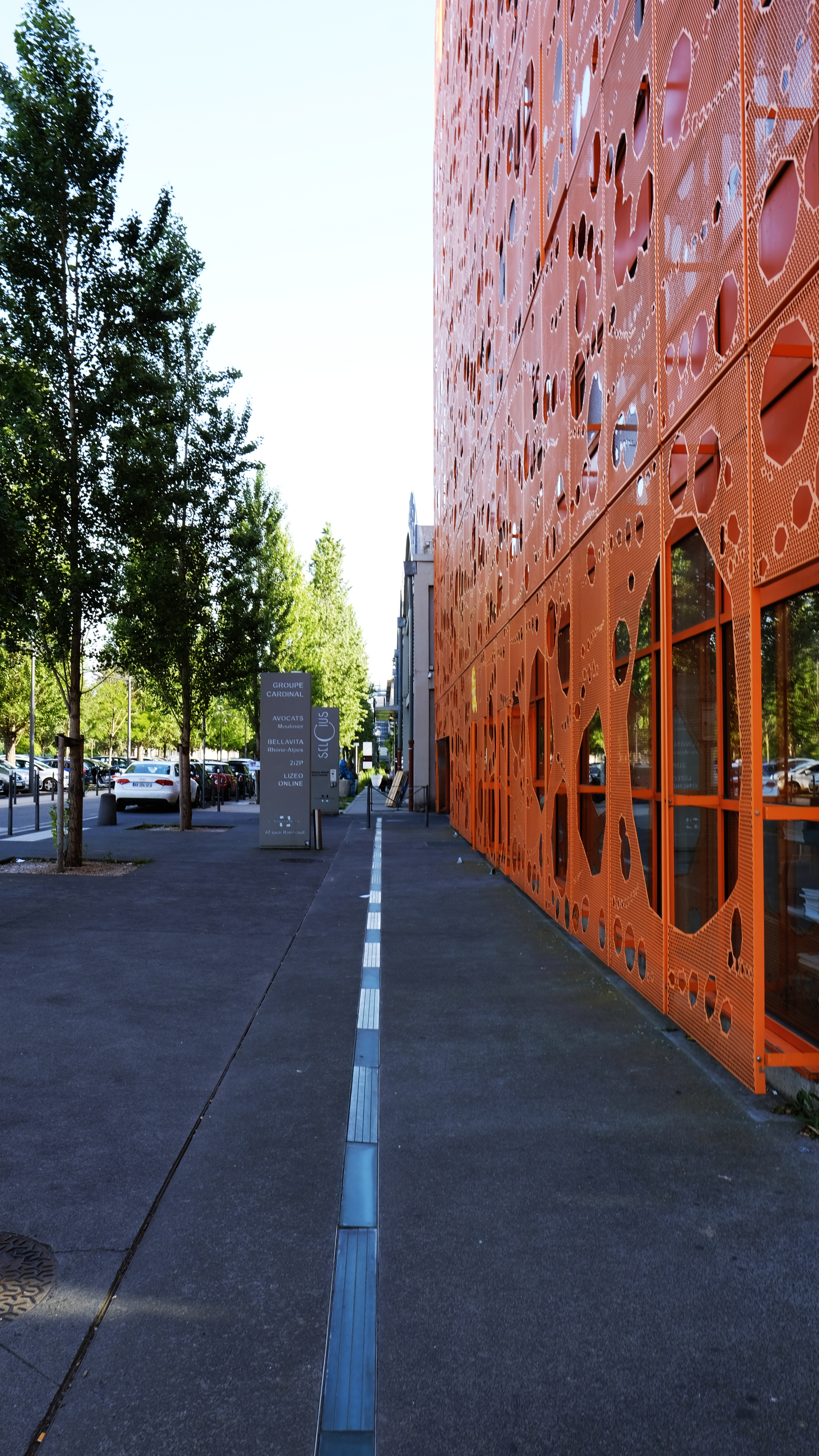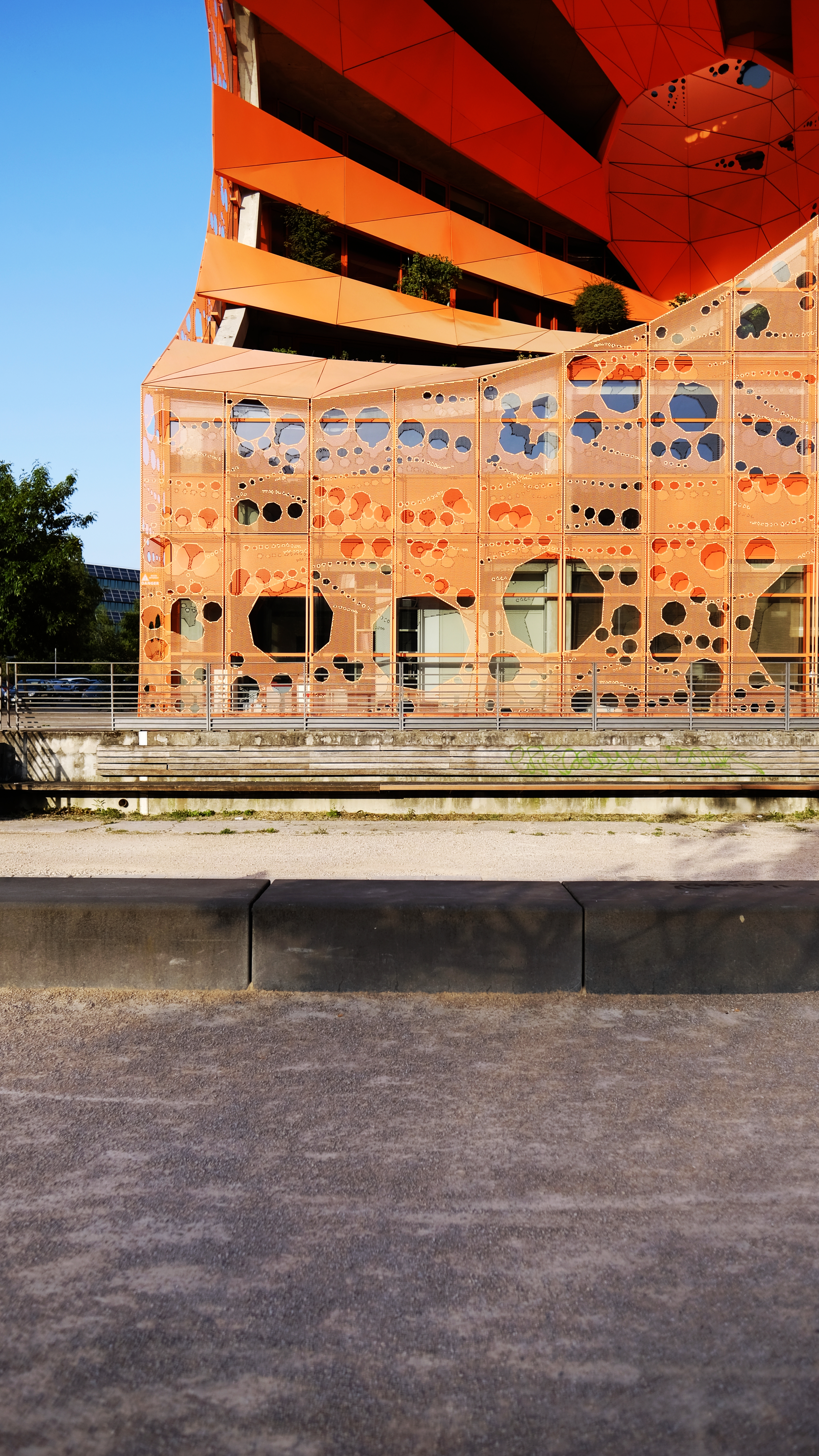 Jakob + Macfarlane also designed the Orange Cube which is an office building by the riverfront. The same concept of the perforated panels on the facade for the Euronews HQ is applied to the Orange Cube. Therefore, you’ll see both the neon green and orange cube during your walk in the Confluence neighborhood.