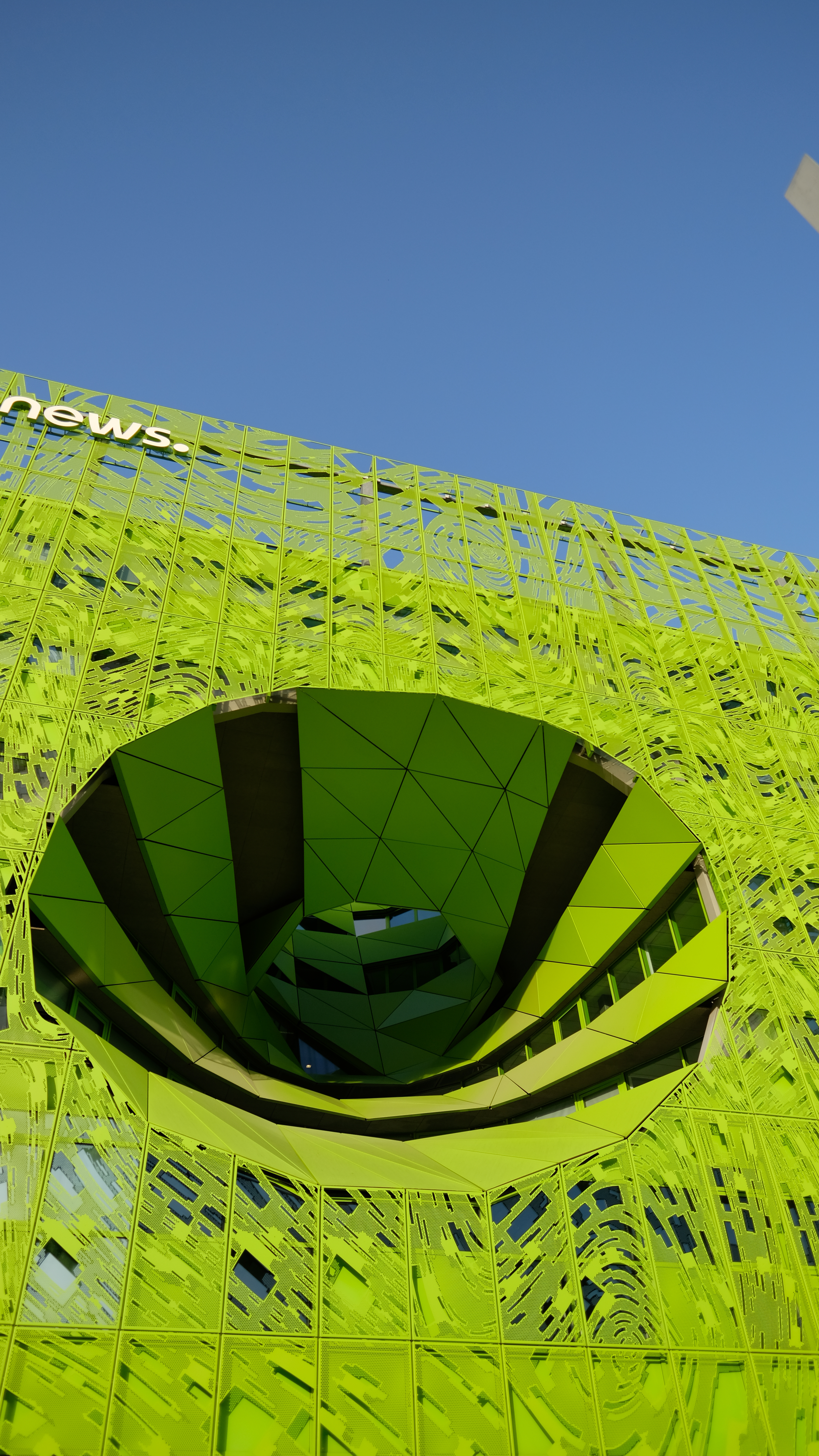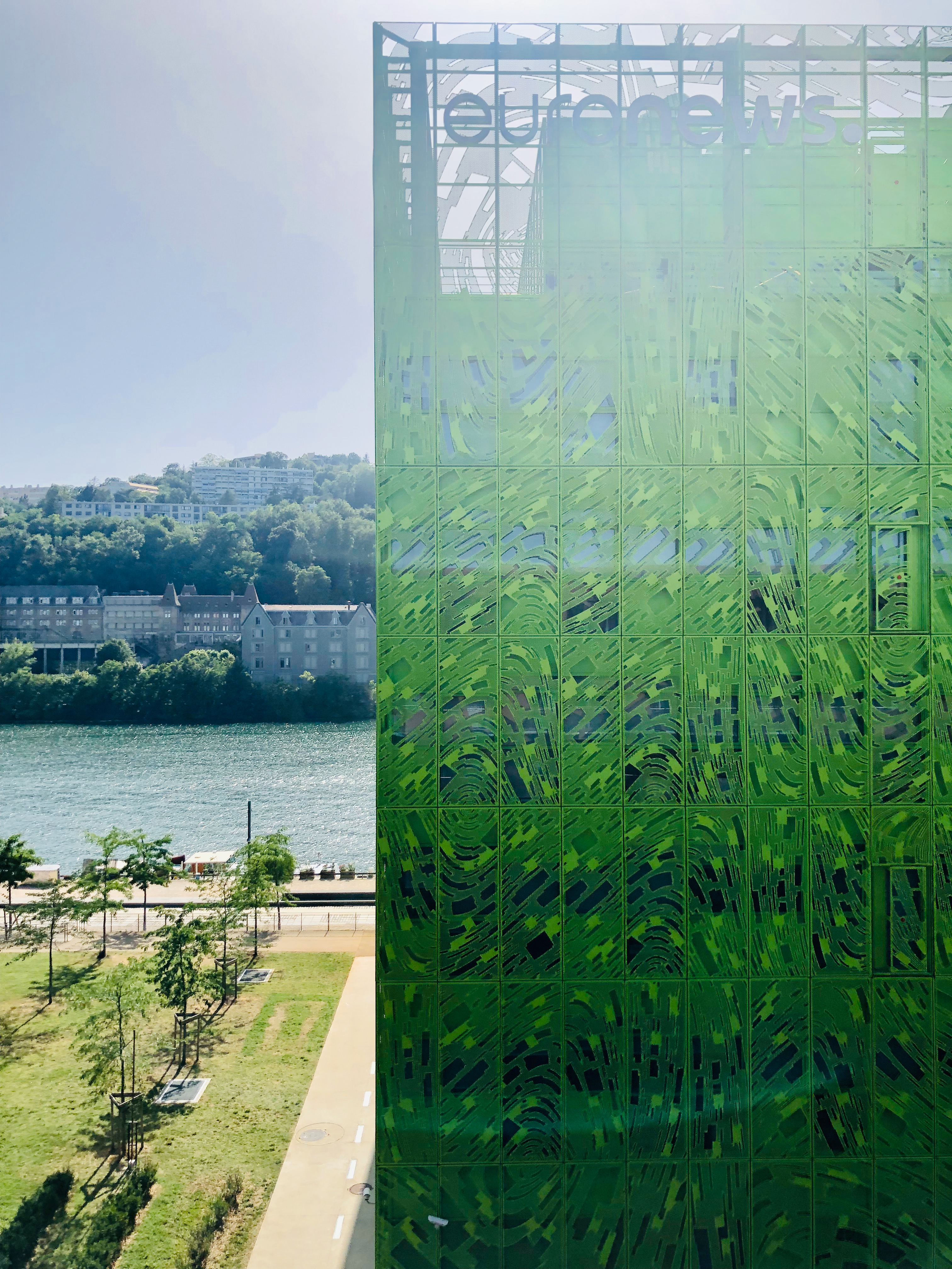 One way to attract attention is to play with colors of the facade and the Euronews Television Headquarters, designed by Jakob and Macfarlane plays with neon green. The facade is made up of custom-designed perforated panels. The hole is made up of solid panels to create rows of transparency for views of the river.