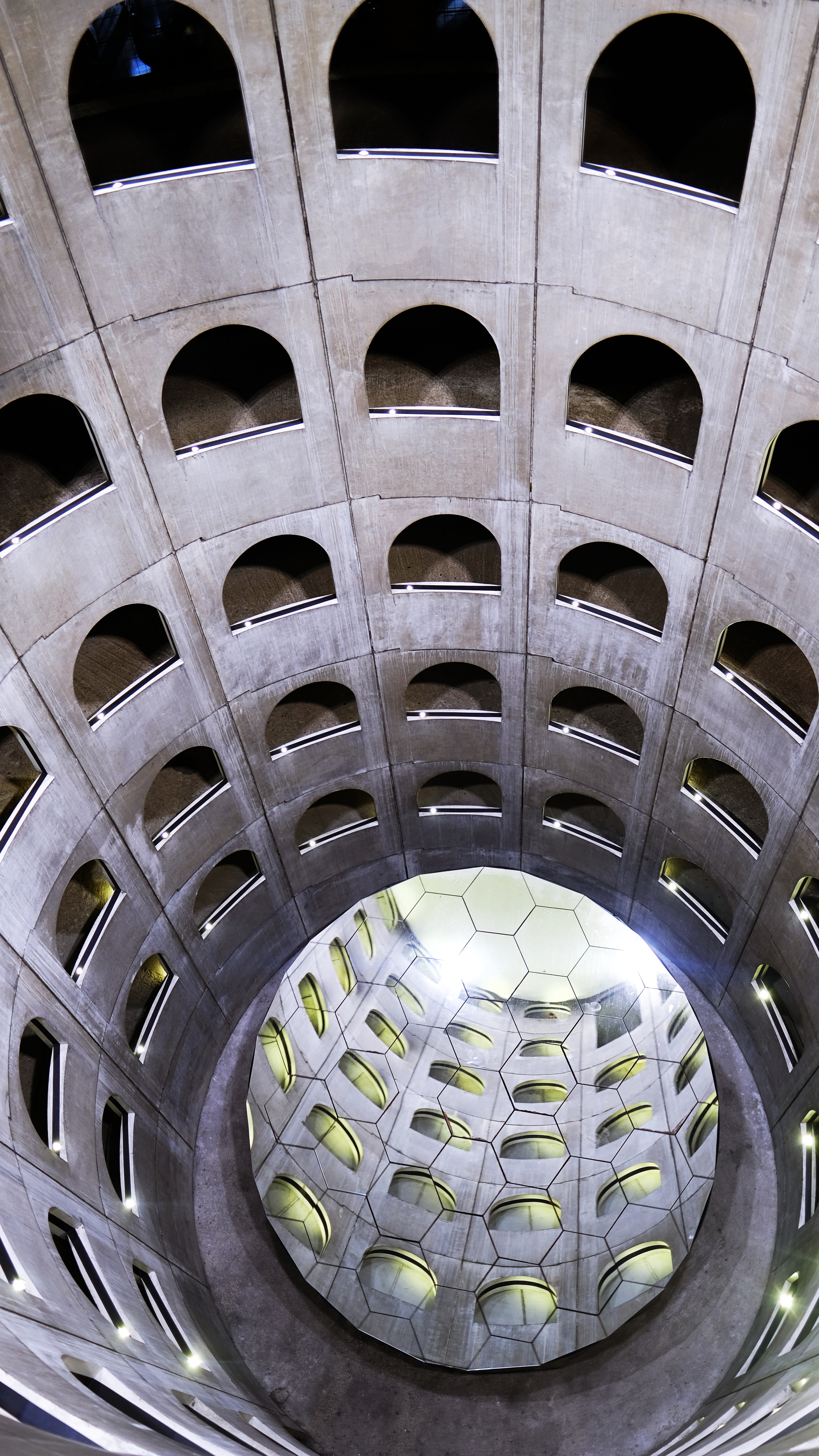 Visiting unique car parks makes a city’s visit more interesting. Parking des Célestins is located at Place des Célestins. Place des Célestins dates back to before 1300s when the Knights Templar owned the land. After Knights Templar was evicted, the Celetines built housing and a theater in the plaza. Eventually, the redevelopment of Place des Célestins in 1995 included adding underground parking, designed by Yan D. Pennors. There is a large lightwell in the middle with a series of arches spiraling up. At the bottom of the lightwell is a large rotating mirror that acts as a refracting telescope by reflecting light into the car park’s interior.