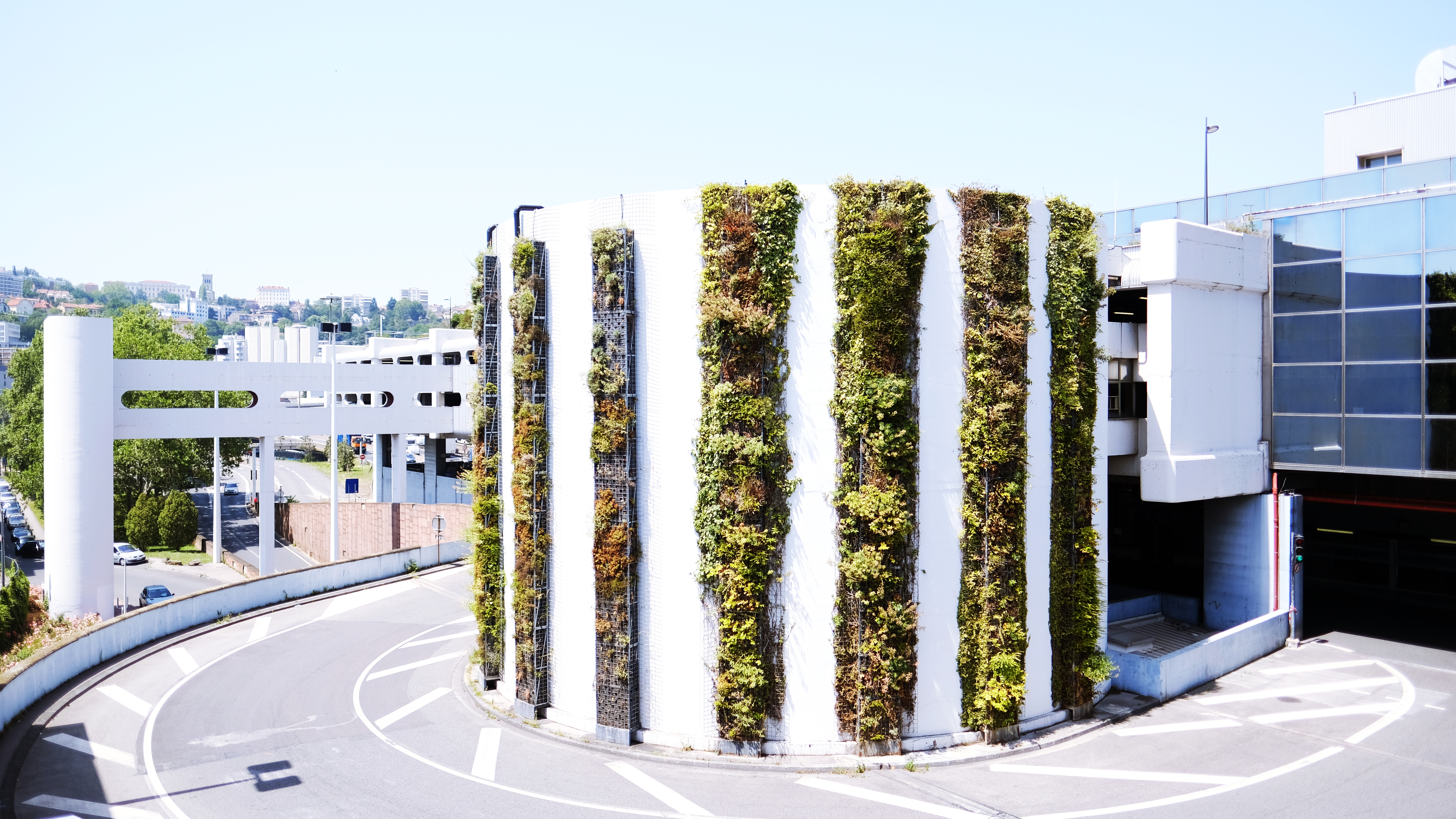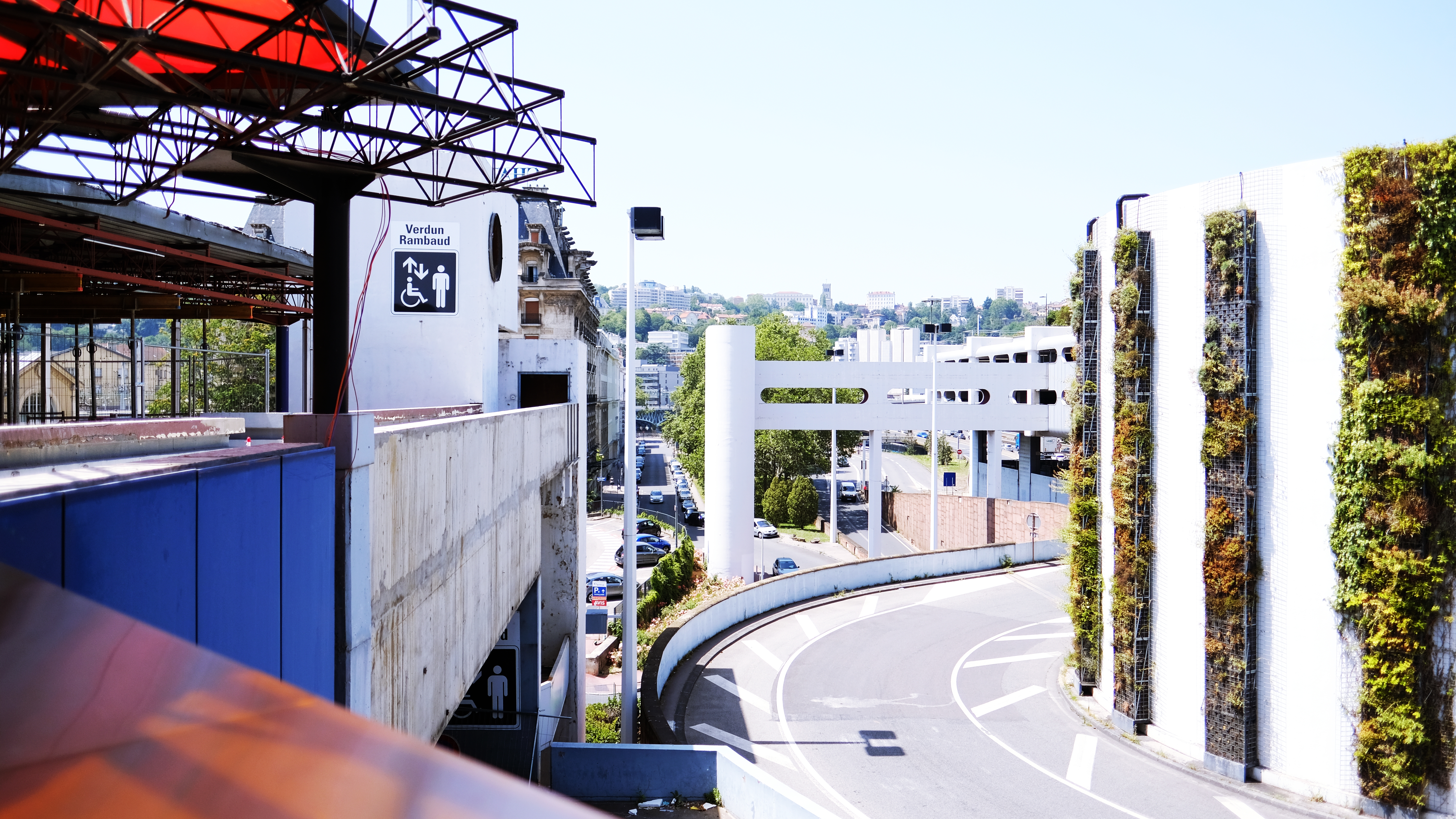 Taking the train from Gare de Lyon Perrache allows one to see how architects turn ordinary train station destinations into fun circulation. French cities are known for the integration of greenary among the built environment. The parking structure for the Perrache station is an example of integrating vertical greenery to break up the solidness of a hard concrete structure. Vertical green strips become transition from the trees to the buildings.